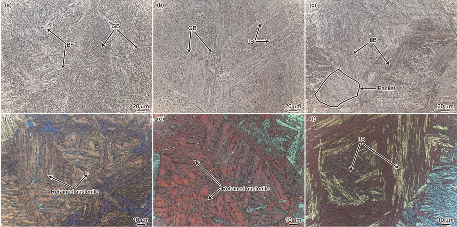 | Fig.11 OM images of weld metal microstructure in different C contents (a, d) 0W, (b, e) 04W, (c, f) 09W; (a~c) OM images, (d~f) color images |