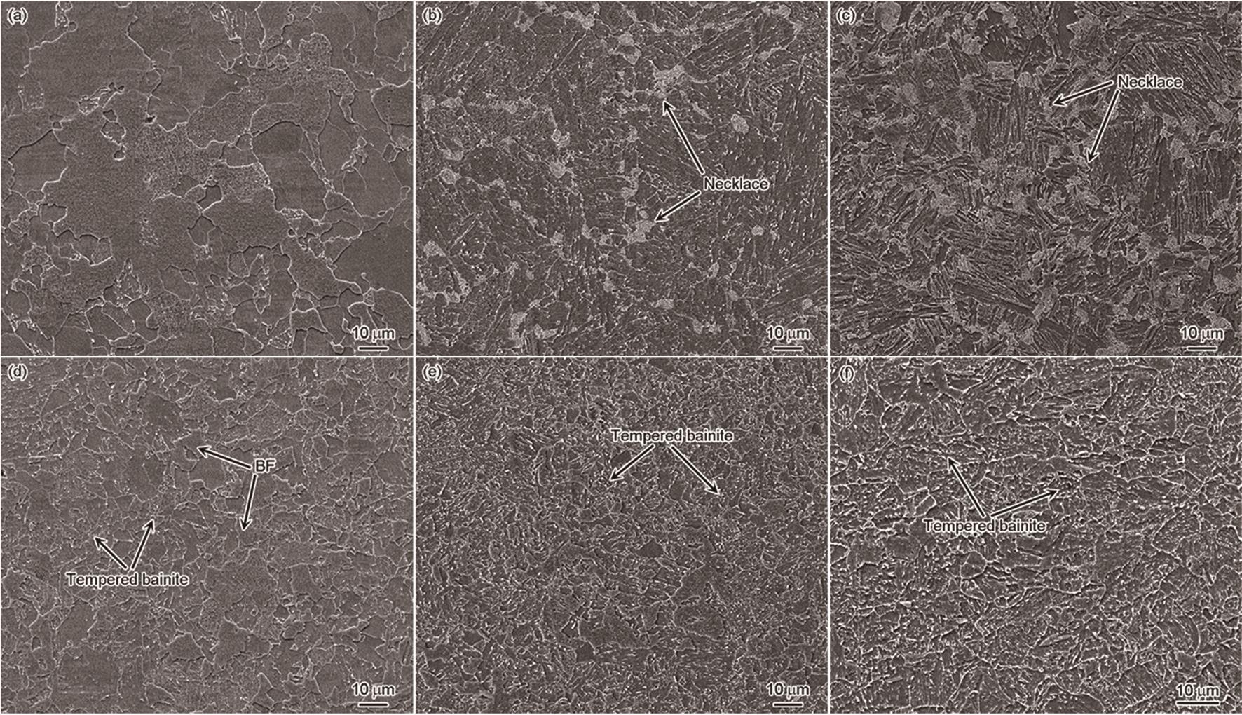 | Fig.14 SEM images of intermediate weld metal in different C contents (a, d) 02C, (b, e) 05C, (c, f) 08C; (a~c) necklace microstructure, (d~f) equiaxed crystal microstructure |