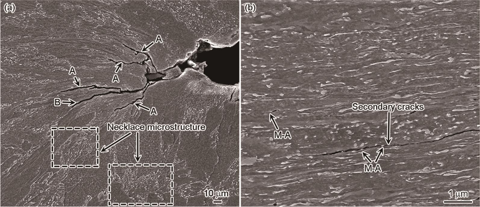| Fig.16 SEM images of secondary cracks (a) secondary cracks in necklace microstructure, (b) the enlarged view of the secondary crack |