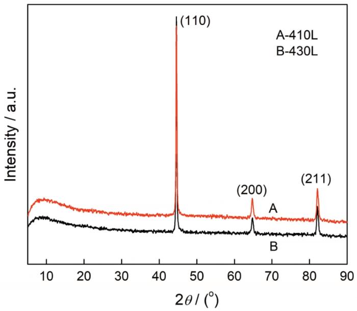 图3给出了410L和 430L不锈钢基体组织的XRD 谱。可以看出,在2θ角为44.6°、64.9°、82.2°处有3个明显的衍射峰,分别对应α-Fe体心立方的(110)、(200)、(211)晶面,由此可确定其基体组织为α铁素体。