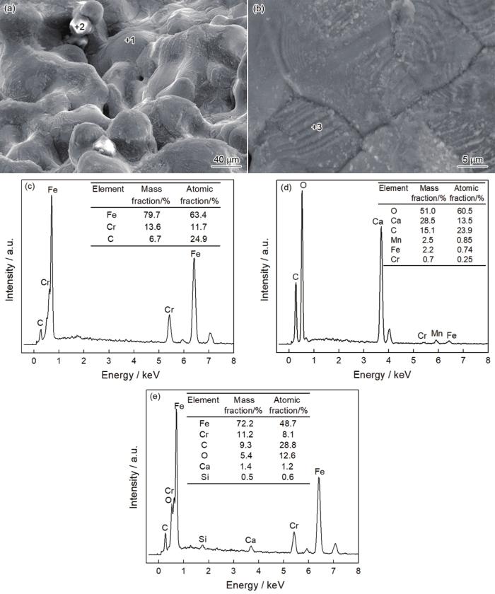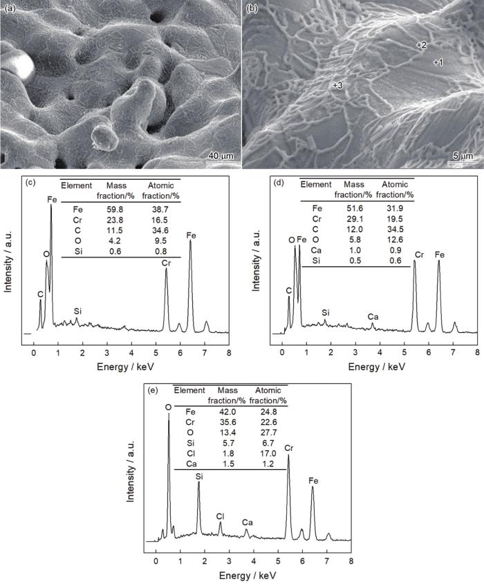 SEM photos and EDS of cell surface of 410L sintered sample (a, b) SEM photos; (c) EDS of mark 1; (d) EDS of mark 2; (e) EDS of mark 3
