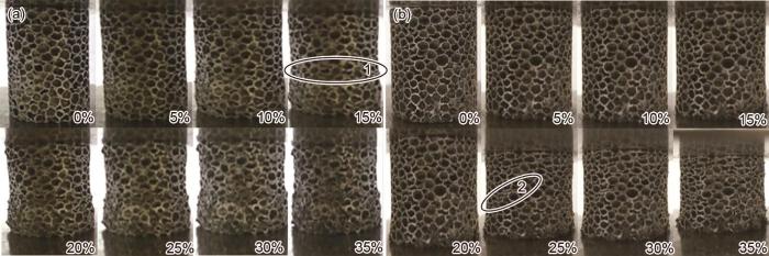 将孔隙率为76%的410L和孔隙率为77%的430L泡沫钢样品用万能试验机进行准静态轴向压缩测试,压头的移动速度为1 mm/min。图6给出了泡沫钢试样在准静态轴向压缩下的变形示意图,其中图6a为410L泡沫钢的初始状态和应变量至35%的变形过程图,图6b为430L泡沫钢的初始状态和应变量至35%的变形过程图。可以看出,应变量为15%时,410L泡沫钢的孔壁发生局部脆性坍塌,导致与受力方向垂直的层断裂(图6a中标注的区域1处)。而对于430L泡沫钢,应变量超过15%时只出现局部孔变形,未出现层断裂;当应变量超过25%时开始形成与受力方向成一定角度的变形带(图6b中标注的区域2处)。对比410L和430L泡沫钢的变形过程图可以看出,410L泡沫钢表现出脆性坍塌特征,而430L泡沫钢表现出较高的强韧性变形特征。