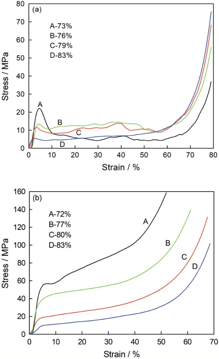 Stress-strain curves of steel foams specimens 410L (a) and 430L (b)