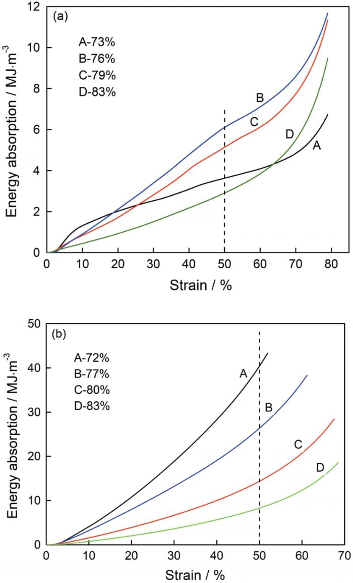 Energy absorption curves of steel foams 410L (a) and 430L (b)