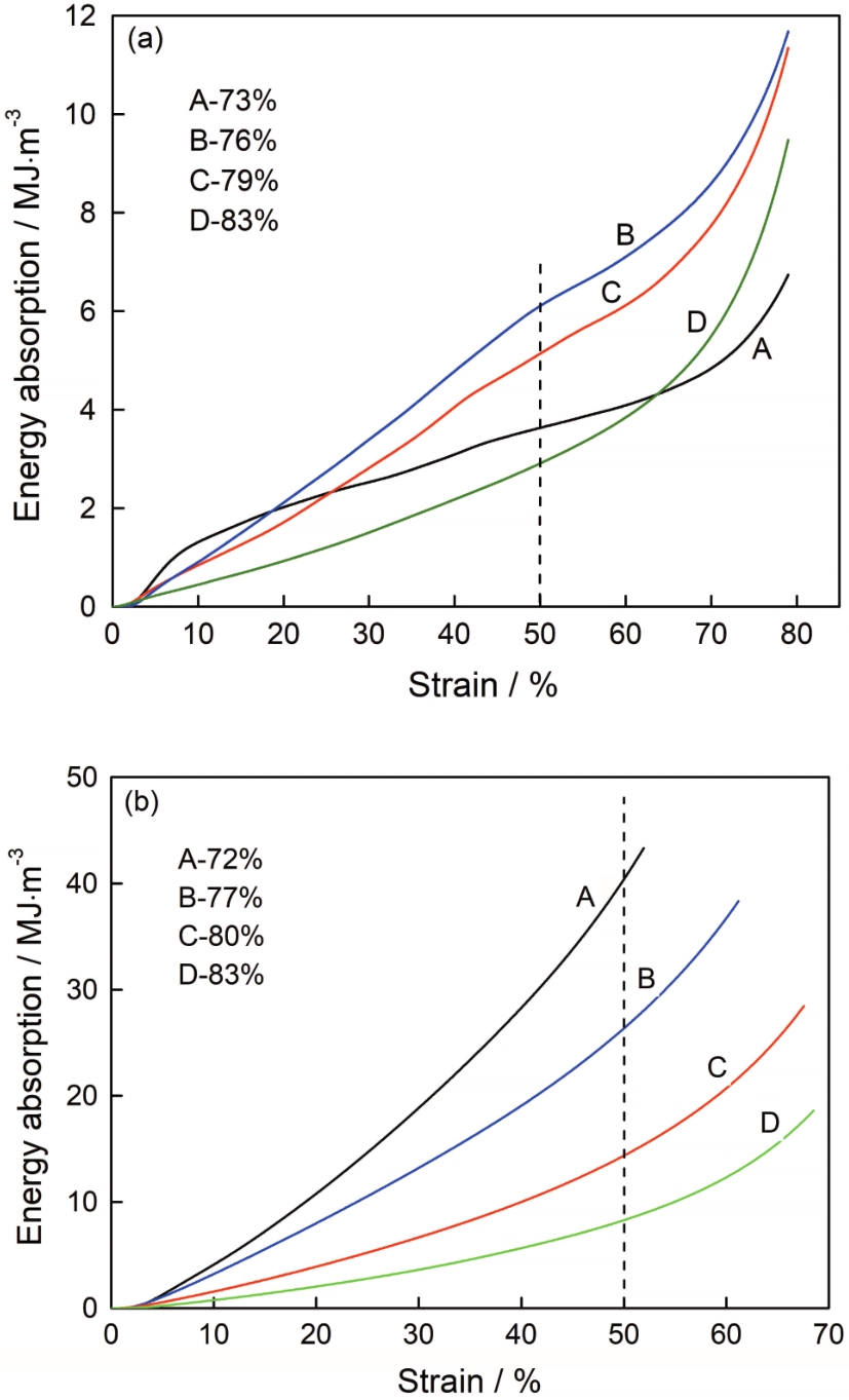 Fig.8 Energy absorption curves of steel foams 410L (a) and 430L (b) |