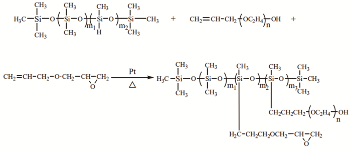 PEO与AGE的吸电子和推电子效应影响双键活性的影响双键电子云在硅氢加成时对氯铂酸的配位作用,因此采用分步加料法。先加入反应活性较低的PEO,进而降低温度加入较高活性的AGE。将亲水性的聚氧化乙烯结构和反应性的环氧基团共接枝在有机硅油主链上,以确保硅氢加成反应的进行并避免环氧基团在高温下不稳定。有机硅油的硅氢加成反应,如图1所示。