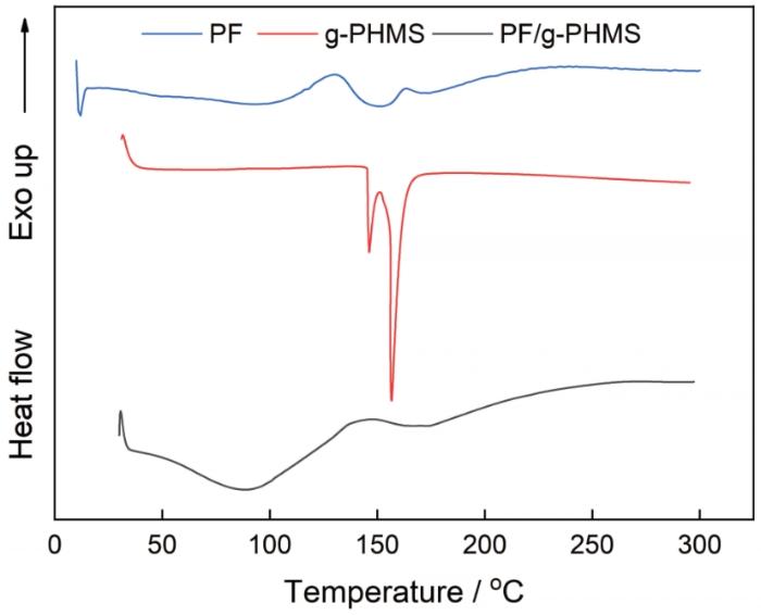 而PF/g-PHMS在90℃左右出现的吸热峰对应物理结合水的脱除,在150℃附近开始出现的放热峰为一宽峰,对应酚醛树脂的固化以及与环氧基团可能发生的开环共聚合。而在175℃左右出现一平缓连续的吸热峰对应有机硅结晶熔融。在共混过程中,酚醛树脂与有机硅分子链之间的深度缠结使酚醛树脂非晶态结构稀释有机硅结晶区,破坏或减弱了有机硅分子链的有序堆砌,使改性有机硅原有的两种结晶结构在酚醛树脂的三维网络中重新排列,变为一种有序结构分布在酚醛树脂中,形成一种类似于半互穿网络的稳定结构。另一方面,在升温到180℃以上的过程中始终伴随着放热行为,对应酚醛树脂的固化以及在碱性条件下在存在酚羟基、羟甲基等活性氢的条件下环氧基团发生的开环反应,参与到酚醛固化反应中。