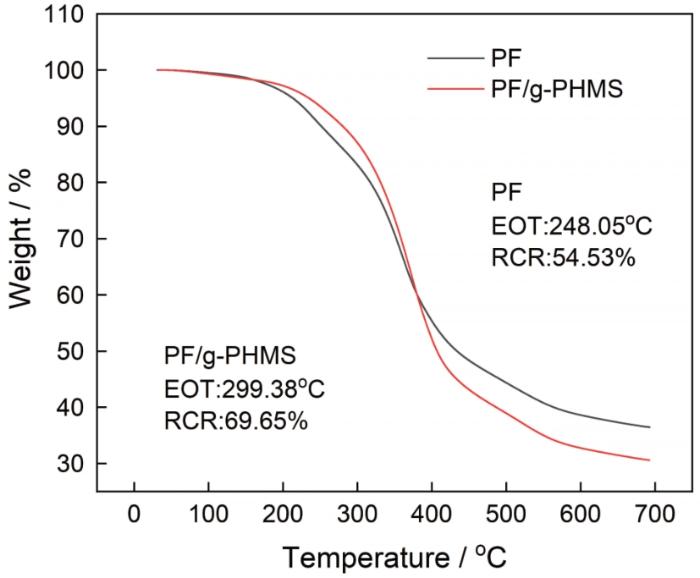 PF/g-PHMS在913 cm-1附近的环氧基团的特征吸收峰强度明显减弱,表明在碱性条件下酚醛体系中的环氧基团发生了开环交联反应,与酚醛树脂的酚羟基、羟甲基发生共聚。对比酚醛树脂的红外吸收峰可以发现,纯酚醛树脂在1000 cm-1处的吸收峰强度比共混树脂强,而1000 cm-1处对应的是羟甲基的C—O吸收峰,表明在共混树脂体系中羟甲基的含量减少。这也进一步说明,共混体系中环氧基团与羟甲基发生的共聚反应消耗了酚醛树脂的部分羟甲基。