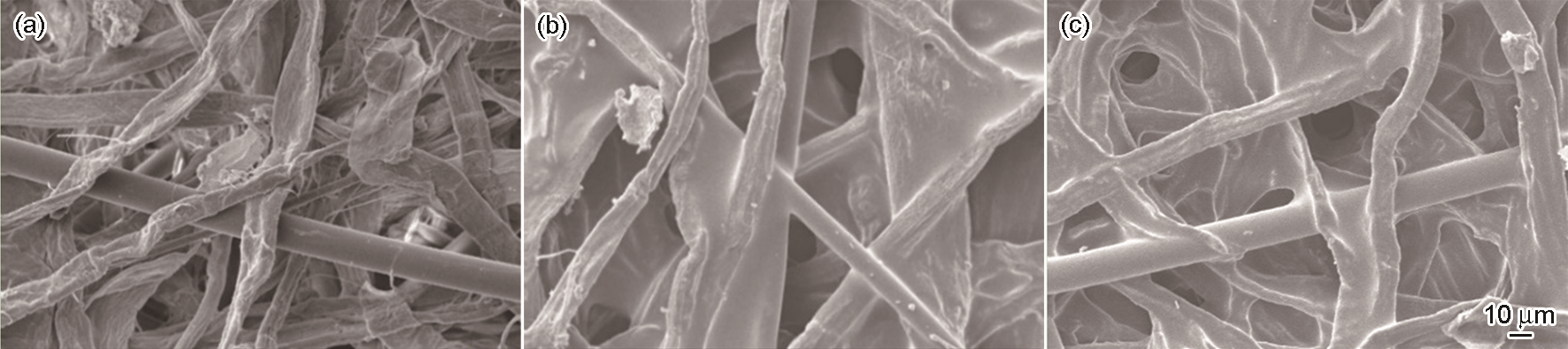 Fig.6 SEM images of oil filter paper (a) origin filter paper, (b) pure phenolic impregnated paper, (c) silicone modified phenolic impregnated paper |