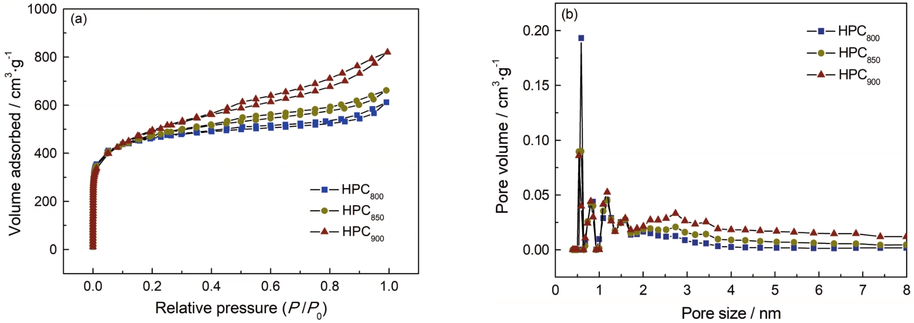 | Fig.3 Nitrogen adsorption-desorption isotherms (a) and pore size distribution (b) of HPC T |