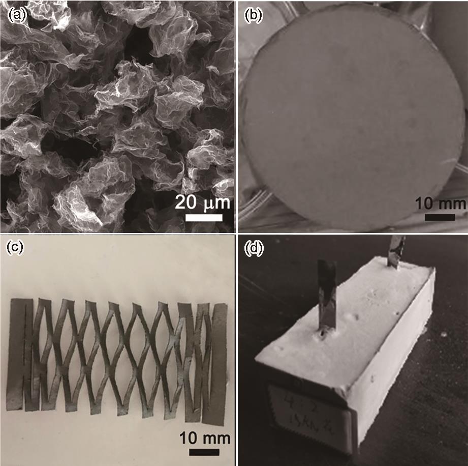| Fig.1 Morphologies of GNS and its derived products (a) GNS powders; (b) GNS paper; (c) GNS paper garland and (d) GNS modified cement-based specimen |