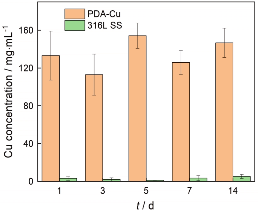 图6 不同样品在人工尿液中浸泡后每天释放的铜离子含量 |