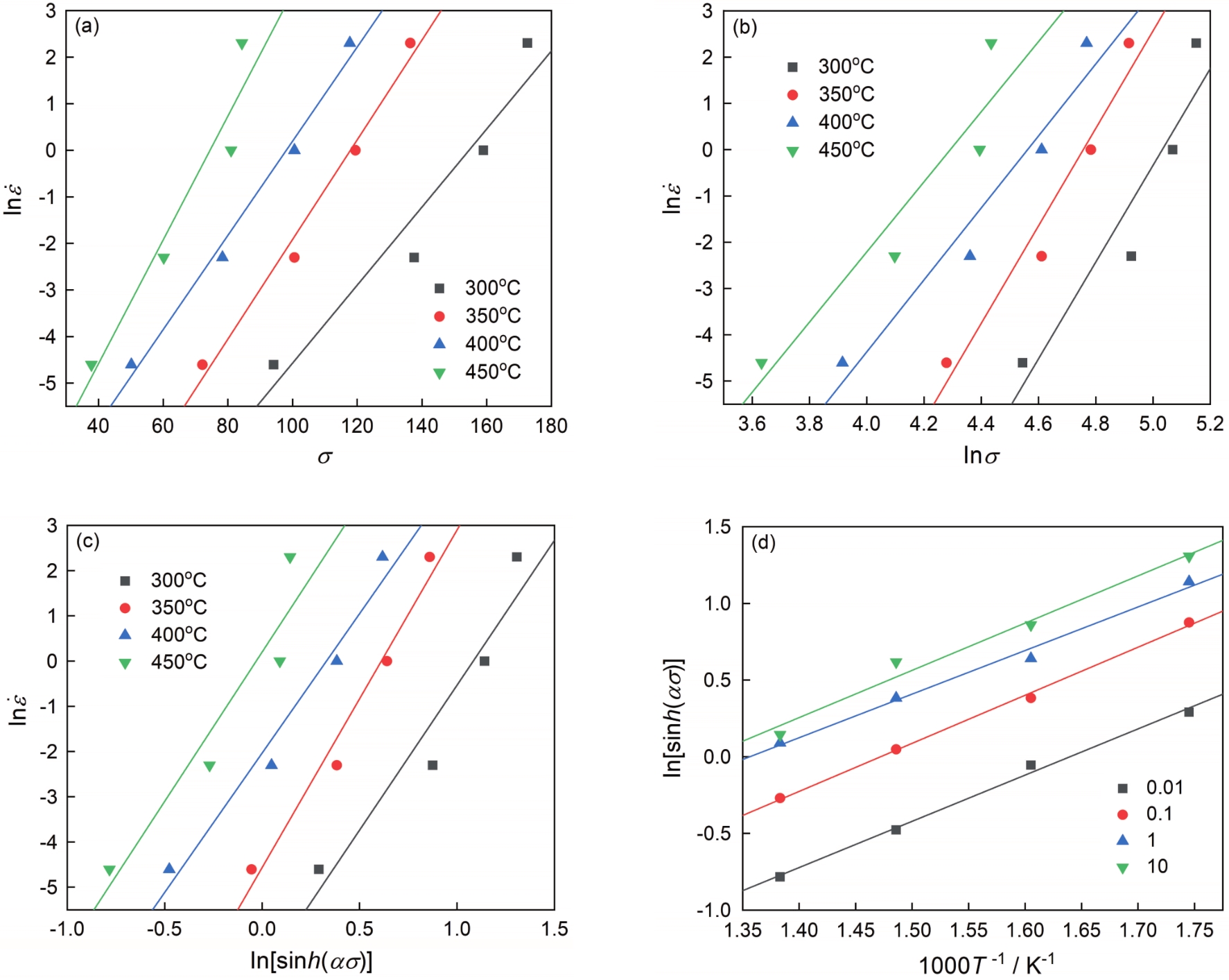 Fig.4 Relationship between peak stress, strain rate and deformation temperature of 2024 aluminum alloy under different deformation conditions (a) |