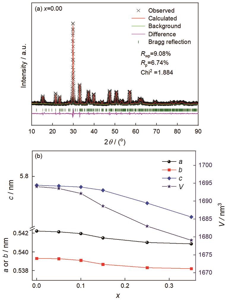 Fig.2 Graphics of Rietveld refinements for BTW-BIT sample (a) and the lattice parameter (a, b, c) and cell volume (V) of BTW-BIT-xEr3+ after refinement (b) |