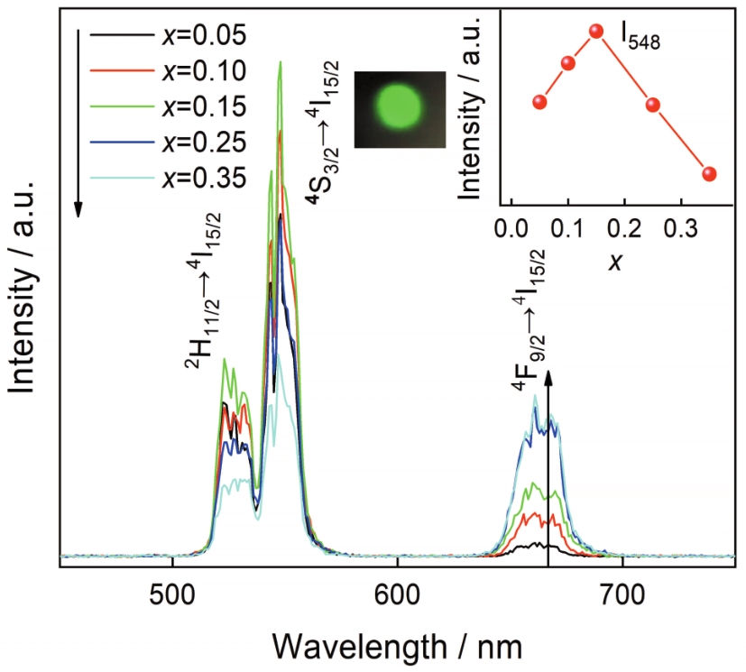 Fig.4 Up-conversion emission spectra at room temperature for BTW-BIT-xEr3+ (x=0.05、0.10、0.15、0.25、0.35) |