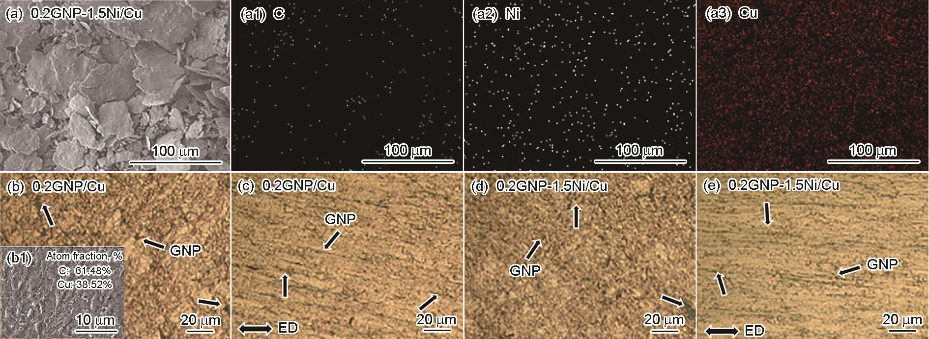Fig.5 Microstructure of 0.2GNP/Cu and 0.2GNP-1.5Ni/Cu composites (a) SEM; (a1~a3) Distribution of C, Ni and Cu elements; (b, d) Optical images of composites after sintering; (b1) EDS; (c, e) Optical images of longitudinal cross-section of composites after hot extrusion, the arrow represents direction of extrusion |