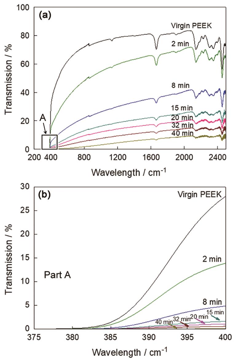 | Fig.11 Transmission curves of PEEK / DLC composition films prepared at different time (a) and enlarged image of part A (b) |