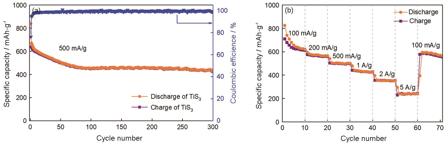 Fig.6 Cycling performance of TiS3 nano powder at 500 mA/g (a) and rate performance (b) of TiS3 nanosheet |