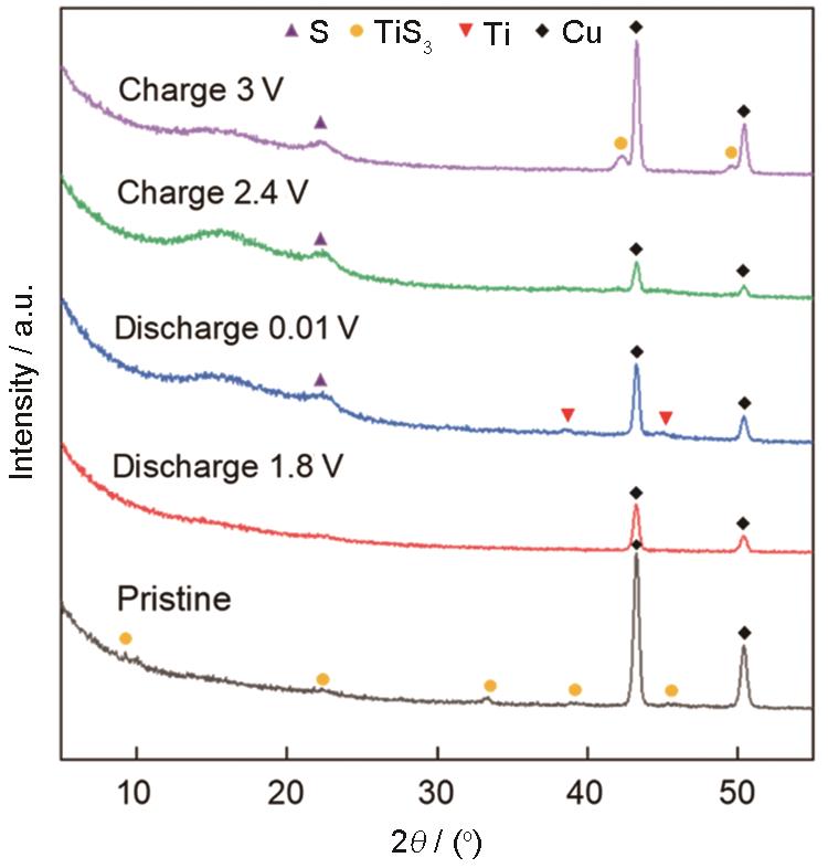 Fig.9 Ex situ XRD pattern from 5° to 55° of TiS3 electrodes at different discharge-charge states |
