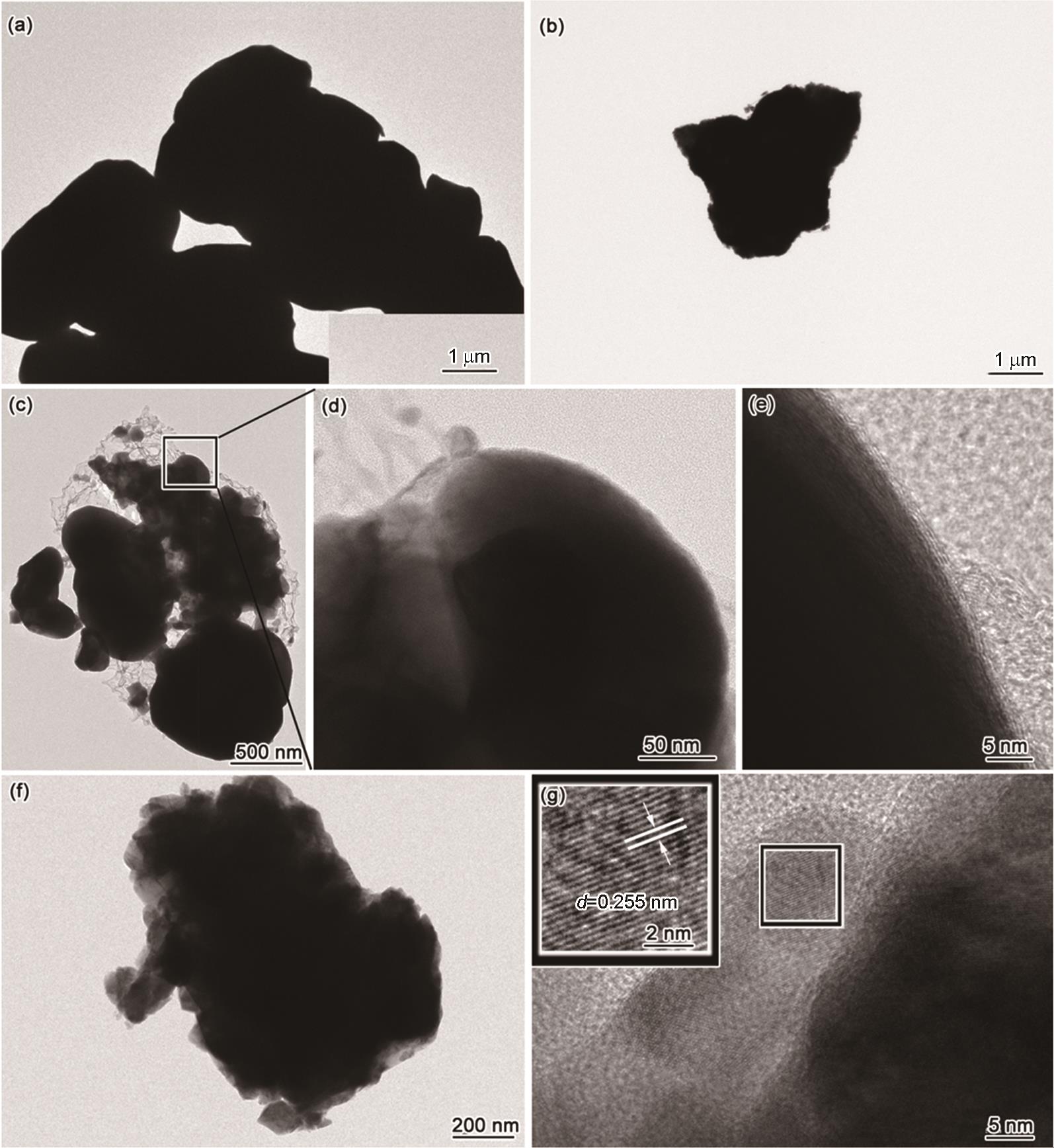 | Fig.6 TEM images of Micro-Cu (a), Micro-Cu-air (b), Micro-Cu-air-Cotton (c, d, e), and Micro-Cu-air-N2 (f, g) |