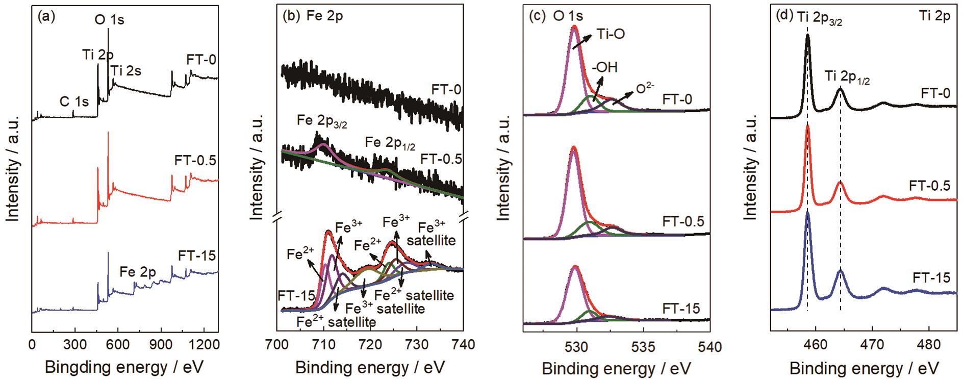 图4 样品FT-0,FT-0.5和FT-15的XPS元素分析的全谱、Fe 2p谱、O 1s谱以及Ti 2p谱 |