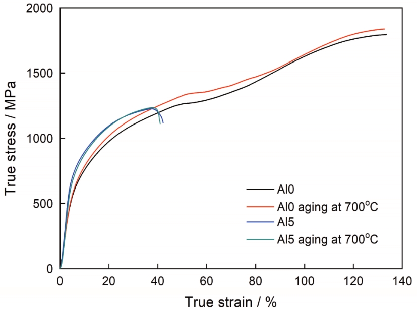 Fig.7 Compression true stress-strain curves of (FeNi-CoCr)100-x Al x (x=0, 5) high-entropy alloys before and after aging |