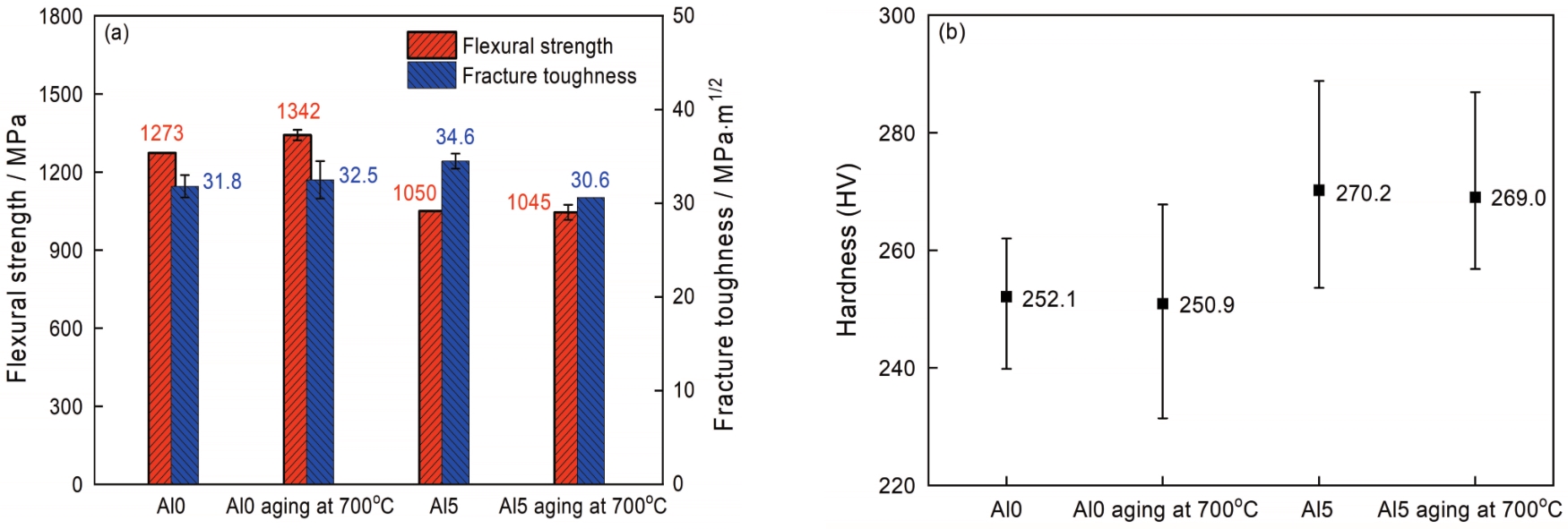 Fig.8 (a) Flexural strength, fracture toughness, and (b) hardness of (FeNiCoCr)100-x Al x (x=0, 5) high-entropy alloys before and after aging |