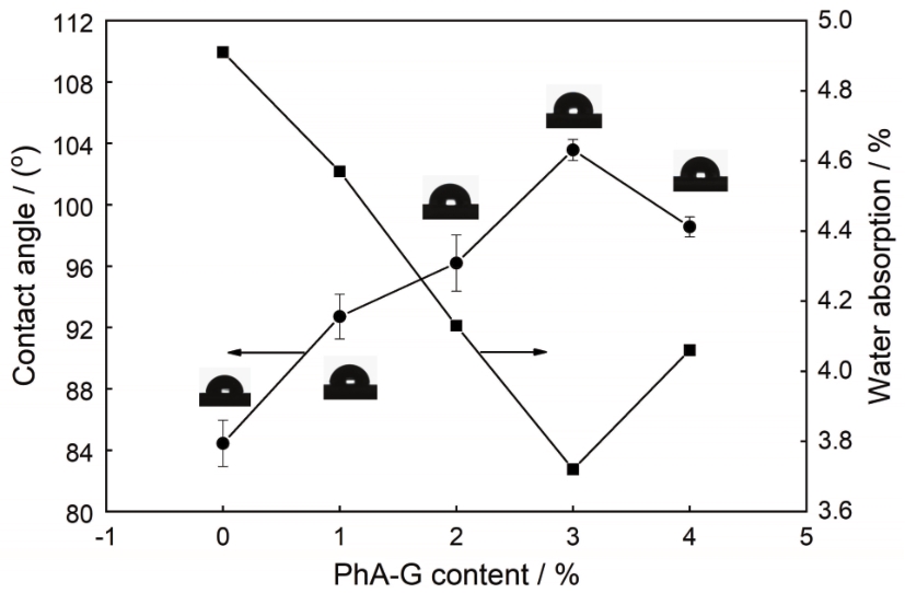 | Fig.7 Effects of the content of PhA-G on the contact angle and water absorption of the composite coating |