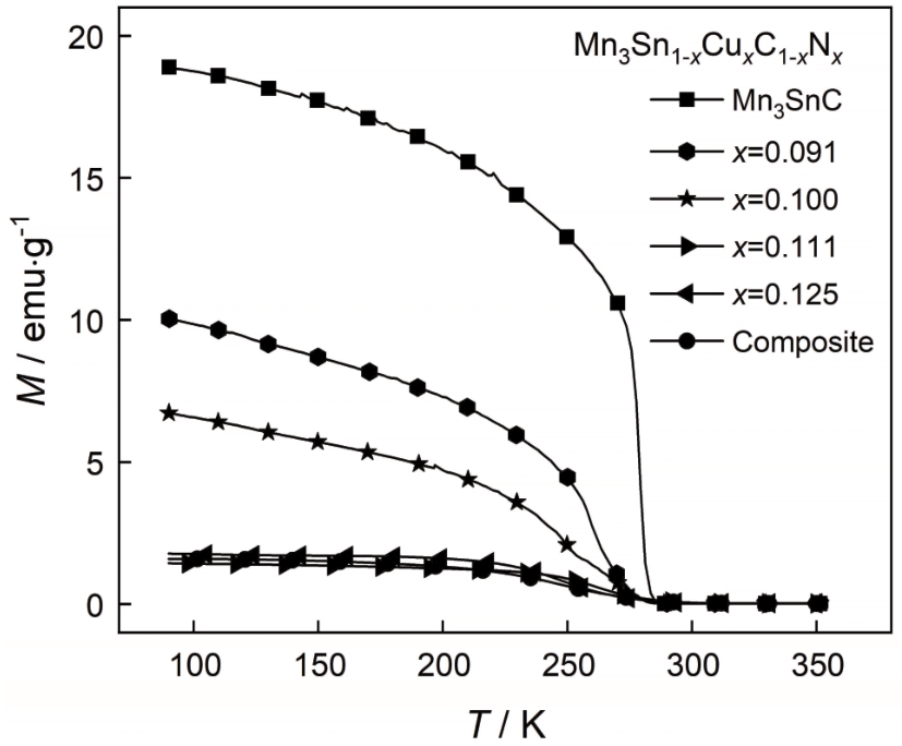 | 图4 Mn3SnC、Mn3Sn1-x Cu x C1-xN x (x=0.125, 0.111, 0.100, 0.091)和复合材料在500 Oe磁场中的磁化强度与温度(M-T)关系 |
