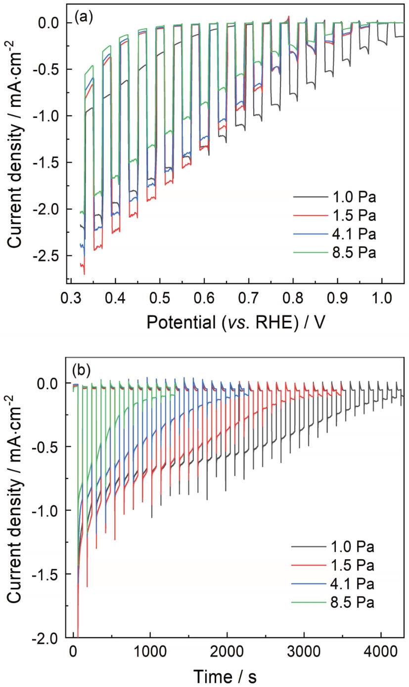 | Fig.15 Applied potential bias-dependent photocurrent density curves (a) and Time dependent photocurrent density curves (b) of CuO NAs photocathodes fabricated under the conditions of a substrate temperature of 400℃, sputtering time of 90 min, pressure of 1.0 Pa, 1.5 Pa, 4.1 Pa, 8.5 Pa, respectively, measured in 0.1 mol/L KOH aqueous solution at 0.56 V (vs. RHE), the area of photoelectrode was 1 cm2 |
