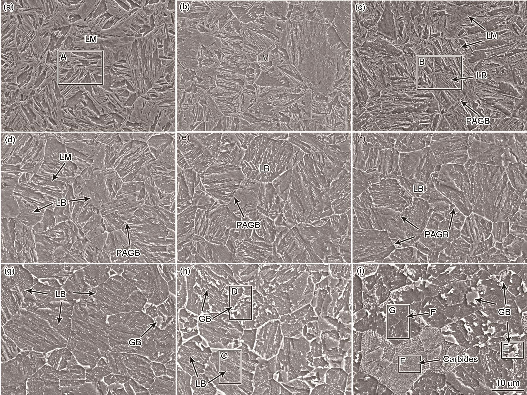 | Fig.2 Low magnified SEM images of experimental steels by different cooling rates (LM-lath martensite; LB-lath bainite; GB-granular bainite; F- ferrite; PAGB-prior austenite grain boundary). (a) 100℃/s (b) 20℃/s (c) 10℃/s (d) 5℃/s (e) 2℃/s (f) 1℃/s (g) 0.5℃/s (h) 0.2℃/s (i) 0.02℃/s |