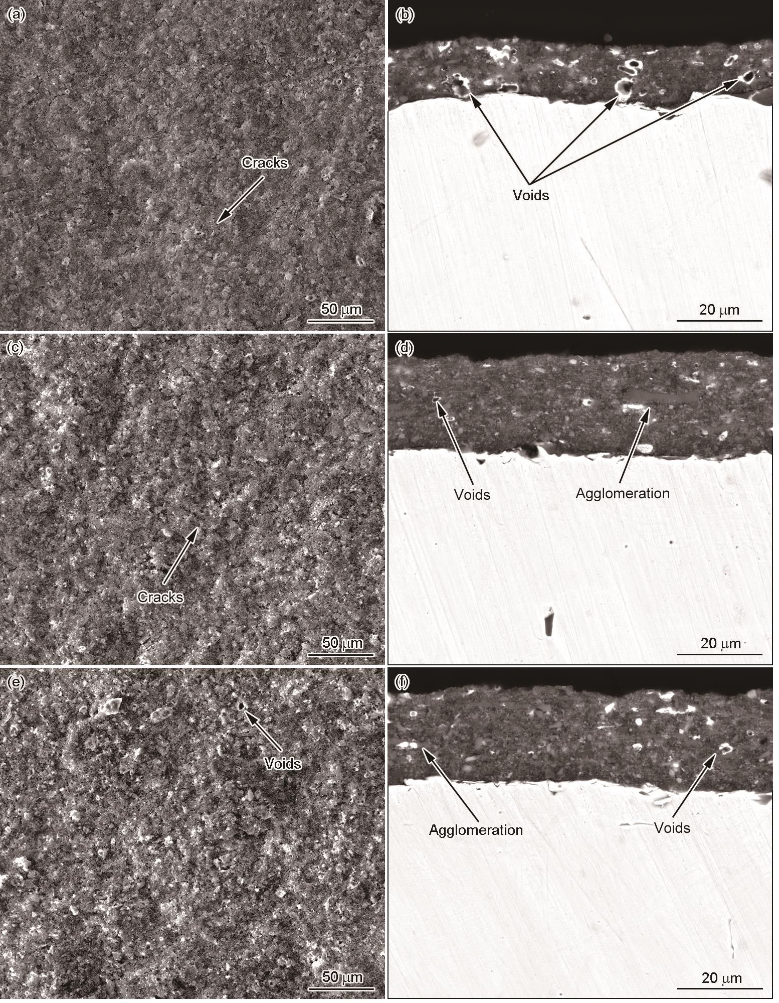 | 图5 1#(a, b) 、2#(c, d) 、3#(e, f)涂层在600℃氧化5 min后的SEM表面和截面形貌 |