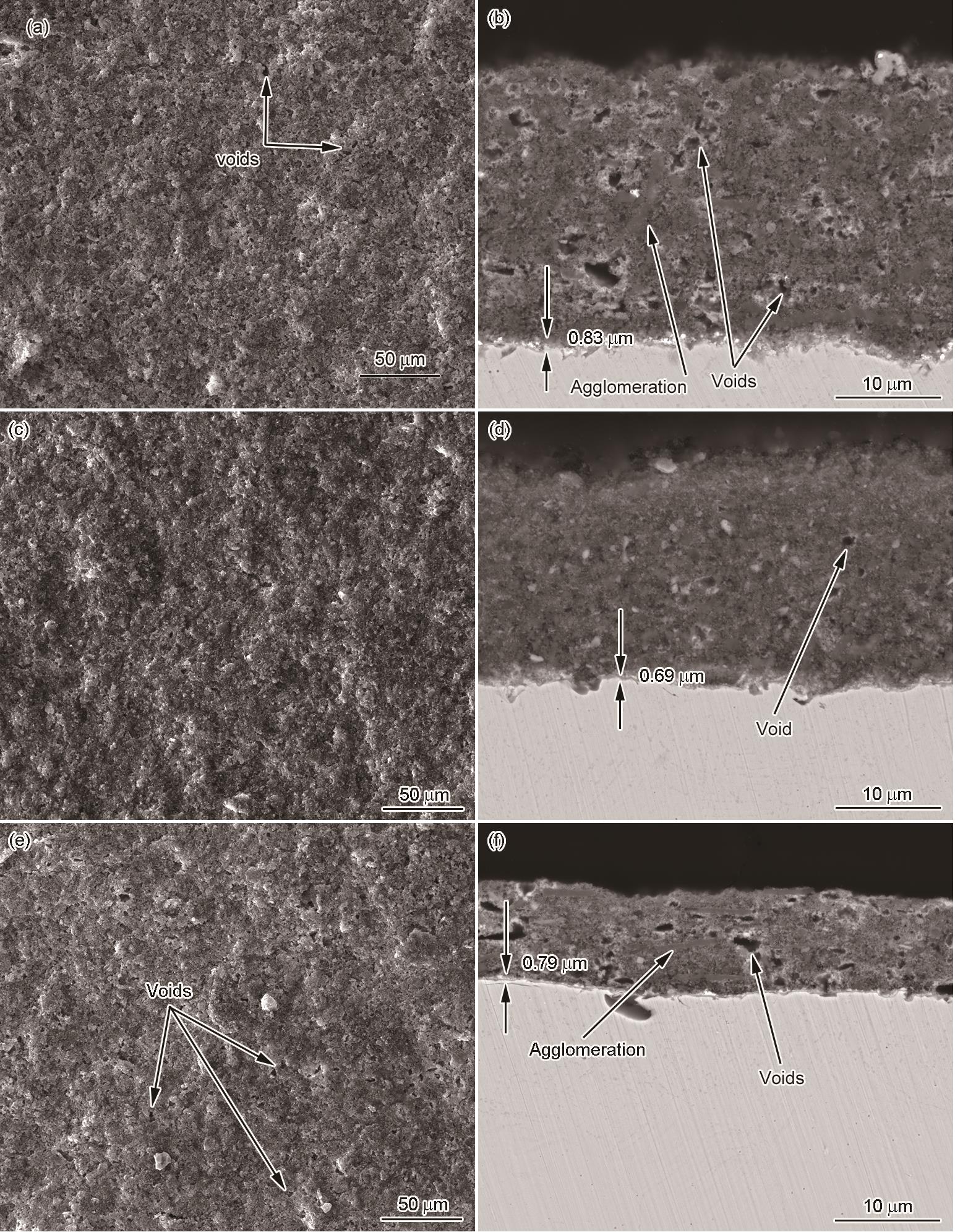 | 图6 1#(a, b)、2#(c, d)、3#(e, f)涂层在600℃氧化1000h后的SEM表面和截面形貌 |
