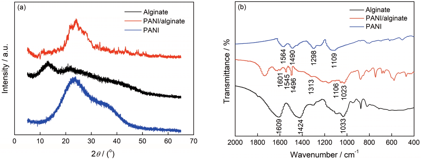 | Fig.2 XRD patterns (a) and FTIR spectra (b) of the alginate film, the PANI film and the PANI/alginate film |