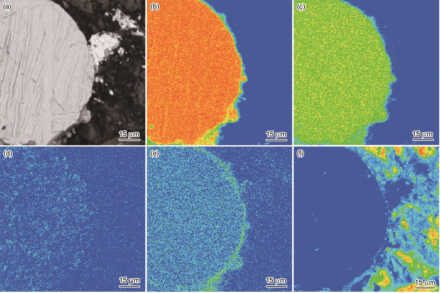 Fig.6 Distribution of elements on the cross-section of oxidized powder after heating to 1150℃ (a) BSE image, (b) Fe, (c) Cr, (d) Y, (e) Ti, (f) O |