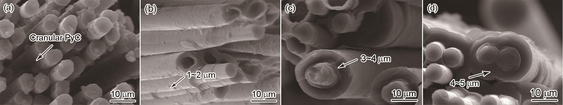 | Fig.1 SEM images of PyC interface layer fabricated by different deposition time (a) S5; (b) S15; (c) S30; (d) S50 |