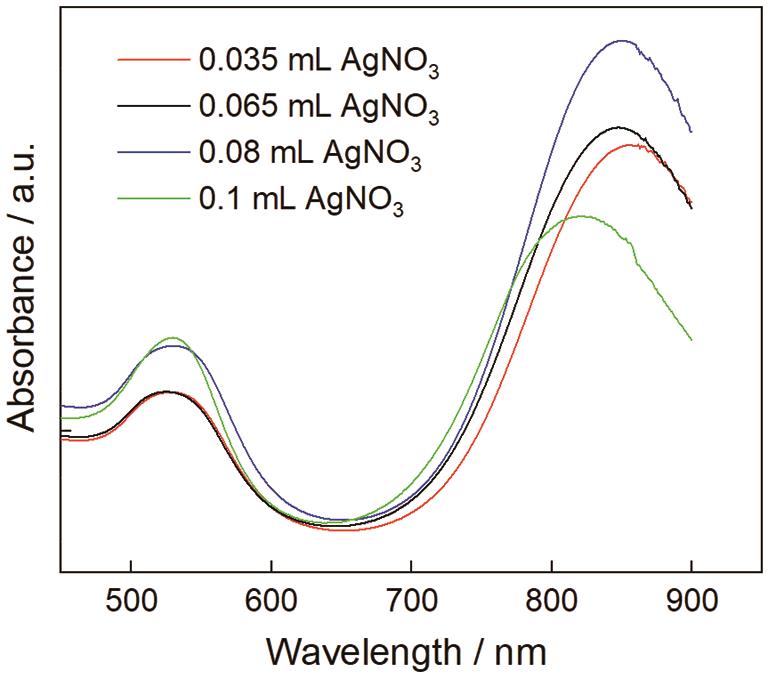 Fig.3 Absorption spectra of gold nanorods prepared with different amounts (0.035、0.065、0.08、0.1 mL) of AgNO3 |