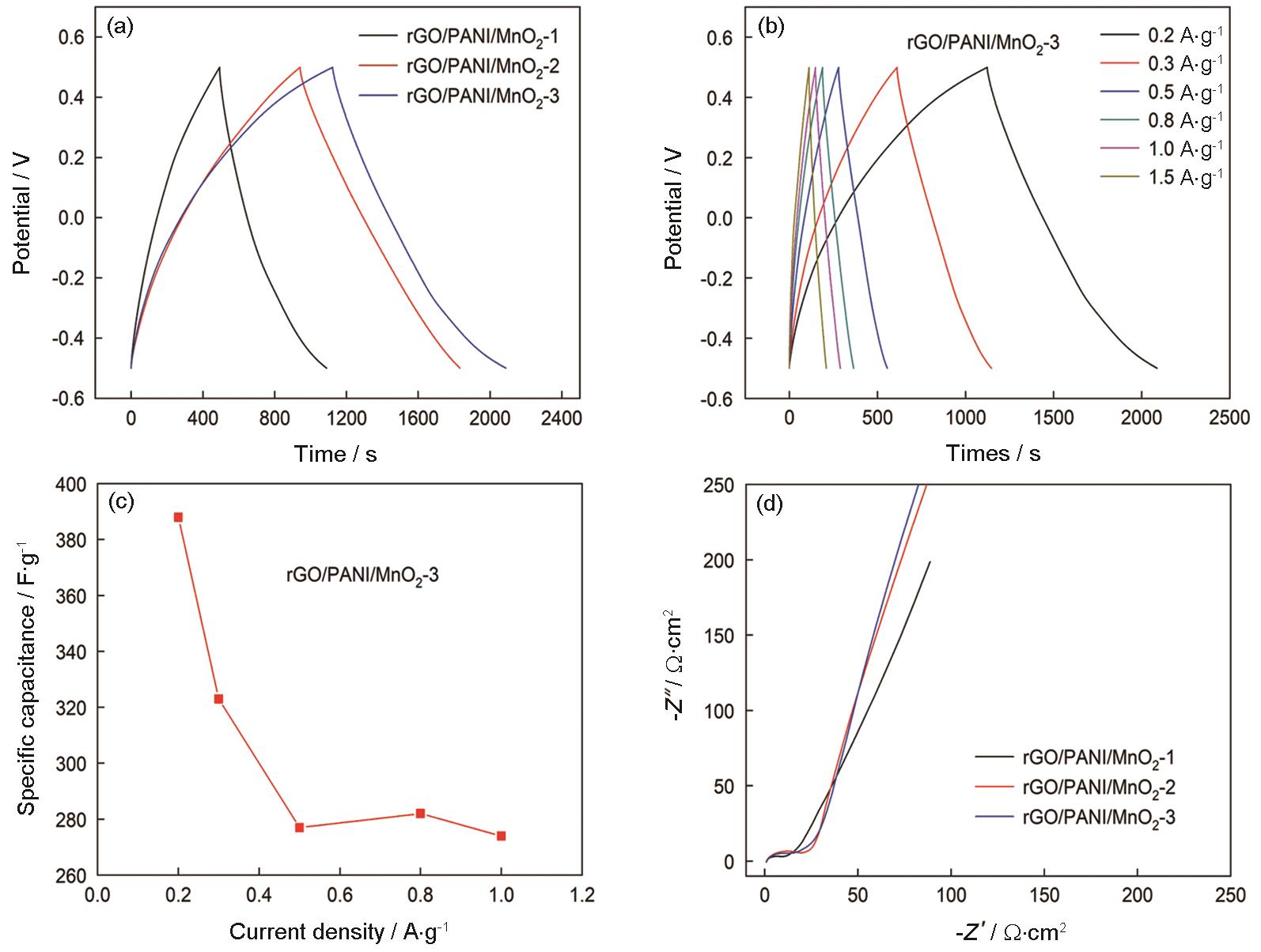 | Fig.6 CP curves of the three composites at 0.2 A·g-1 (a), CP curves of rGO/PANI/MnO2-3 under different current densities (b), the relationships between Ce and current densities of rGO/PANI/MnO2-3 (c) and EIS curve of the three composites (d) |