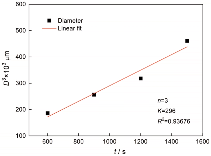 | 图5 锡青铜的平均晶粒尺寸D3与等温时间关系的散点图和线性拟合 |