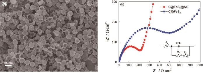 SEM image of C@FeS2@NC after 500 cycles at 1 A·g-1 current density (a) and EIS spectra of C@FeS2@NC and C@FeS2 after 3 cycles at 1.2 V (b)