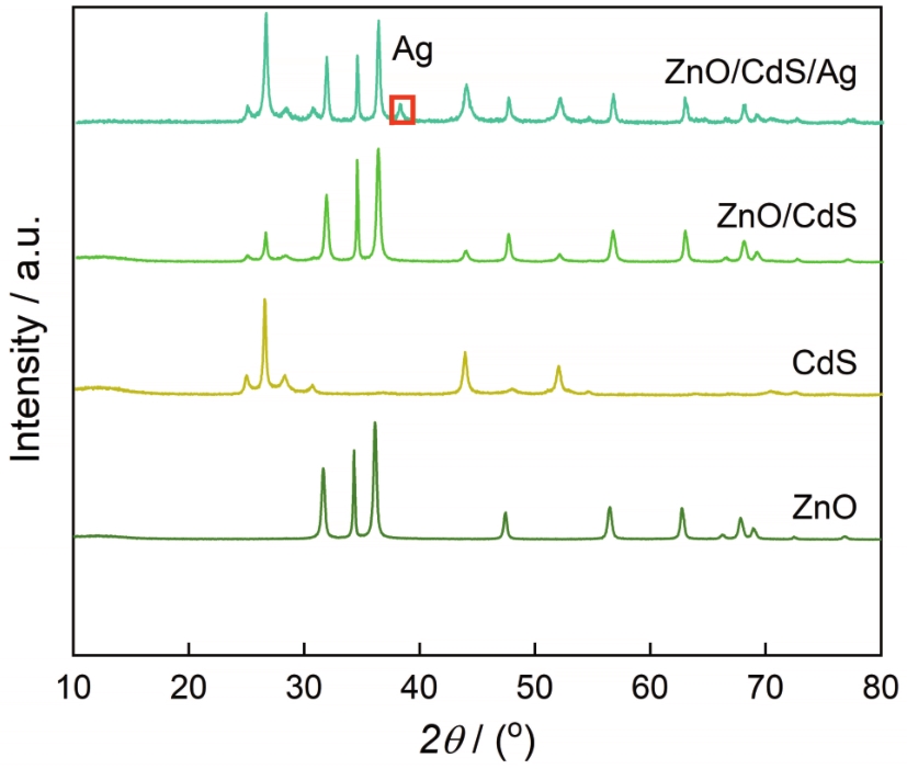 图2 ZnO、CdS、ZnO/CdS和ZnO/CdS/Ag催化剂的XRD谱 |
