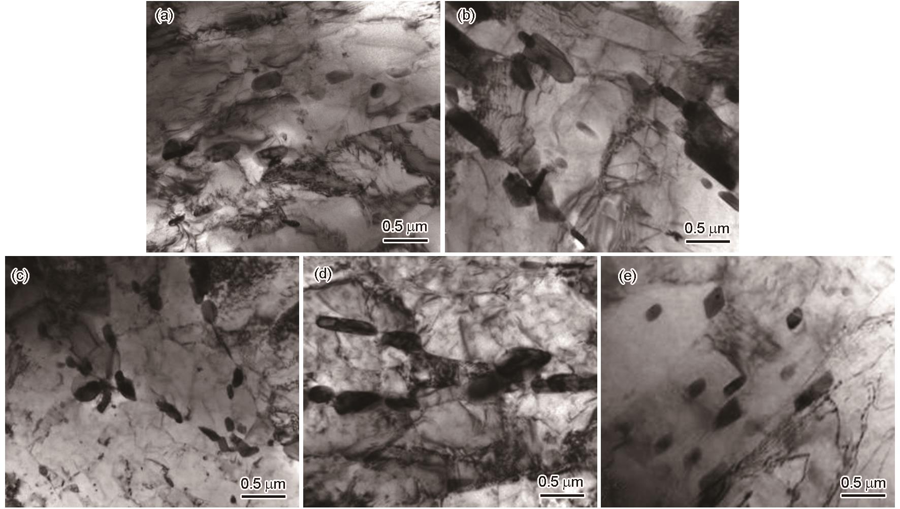 | Fig.11 Transmission electron microscope morphology of carbides in base metal of non-service steel pipe and each area of steel pipe joint in service (a) NBM, (b) BM, (c) SHAZ, (d) WZ, (e) BHAZ |