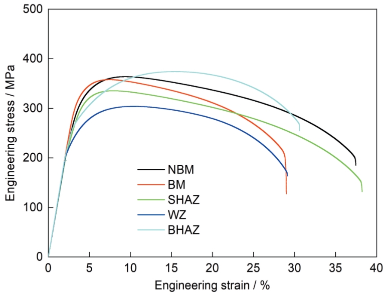 | 图7 未服役钢管母材和服役钢管接头各区域的高温拉伸应力-应变曲线 |