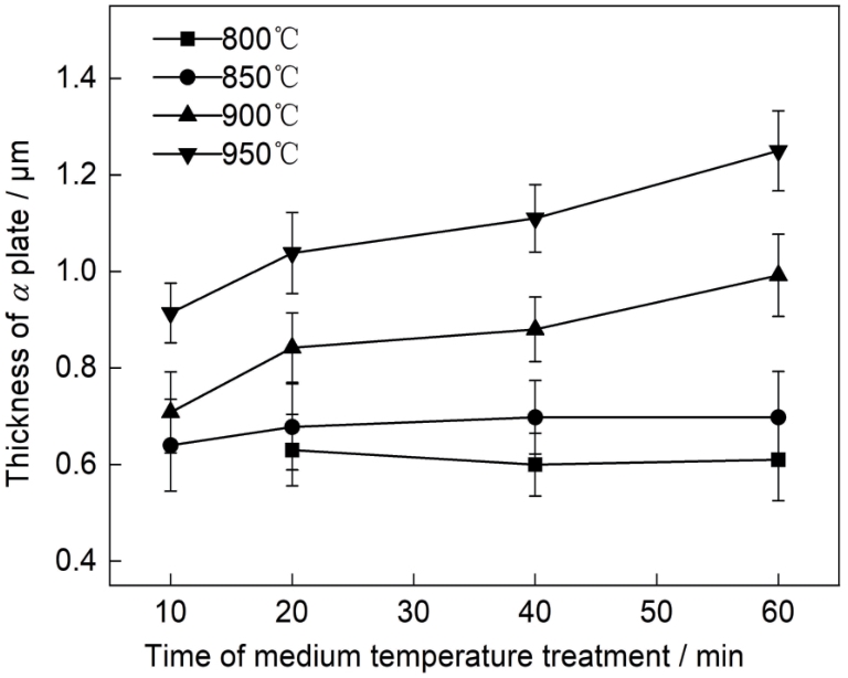 | 图2 不同条件中温热处理后Ti65合金中α相变板条的宽度 |