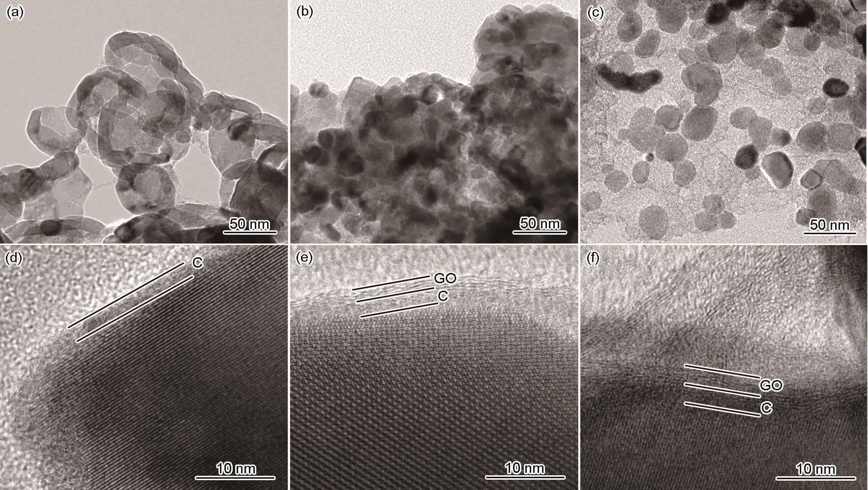 | Fig.5 HRTEM images of NVP with different GO contents (a, d) 0.0%; (b, e) 2.5%; (c, f) 5.0% |