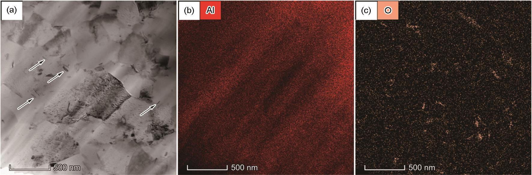Fig.5 STEM-BF image of Al matrix (a), and EDS mapping (b, c) of the same position of (a) |