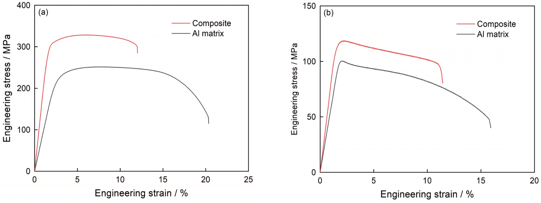 | Fig.6 Tensile stress-strain curves of composite and Al matrix at RT (a) and 350℃ (b) |