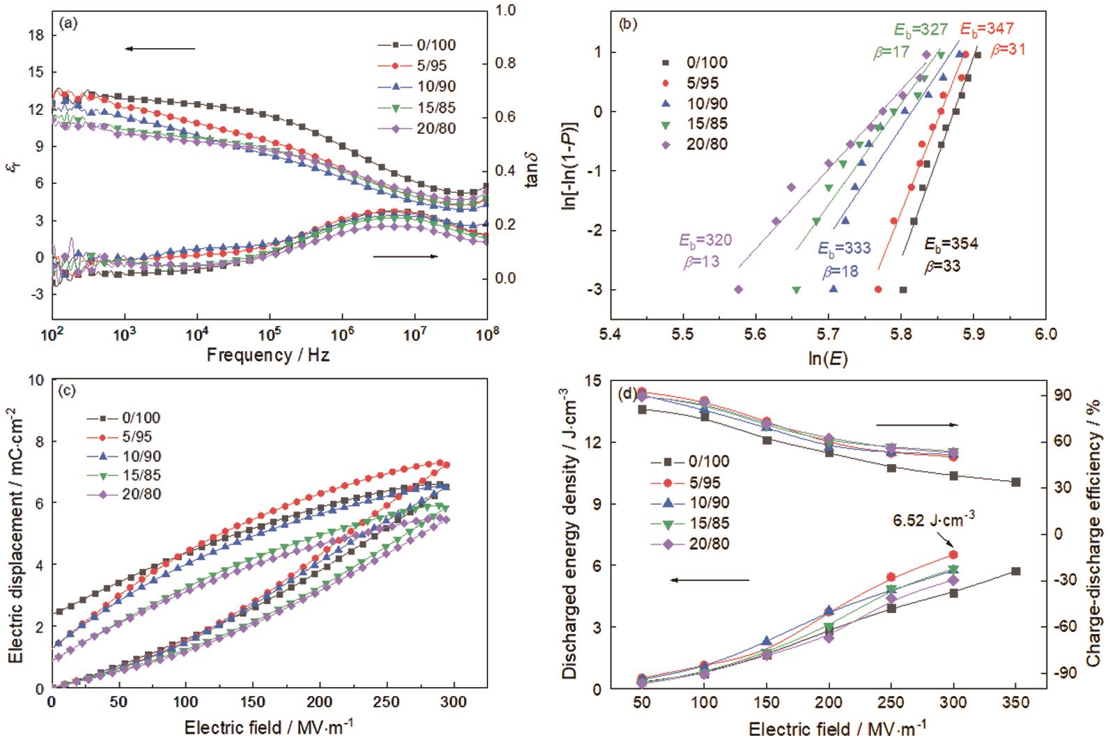 Fig.5 Dielectric and ferroelectric performance of PI/PVDF composite film (a) room temperature dielectric constant εr and dielectric loss tanδ versus frequency, (b) weibull distribution, (c) D-E loops, (d) discharged energy density and charge-discharge efficiencies |