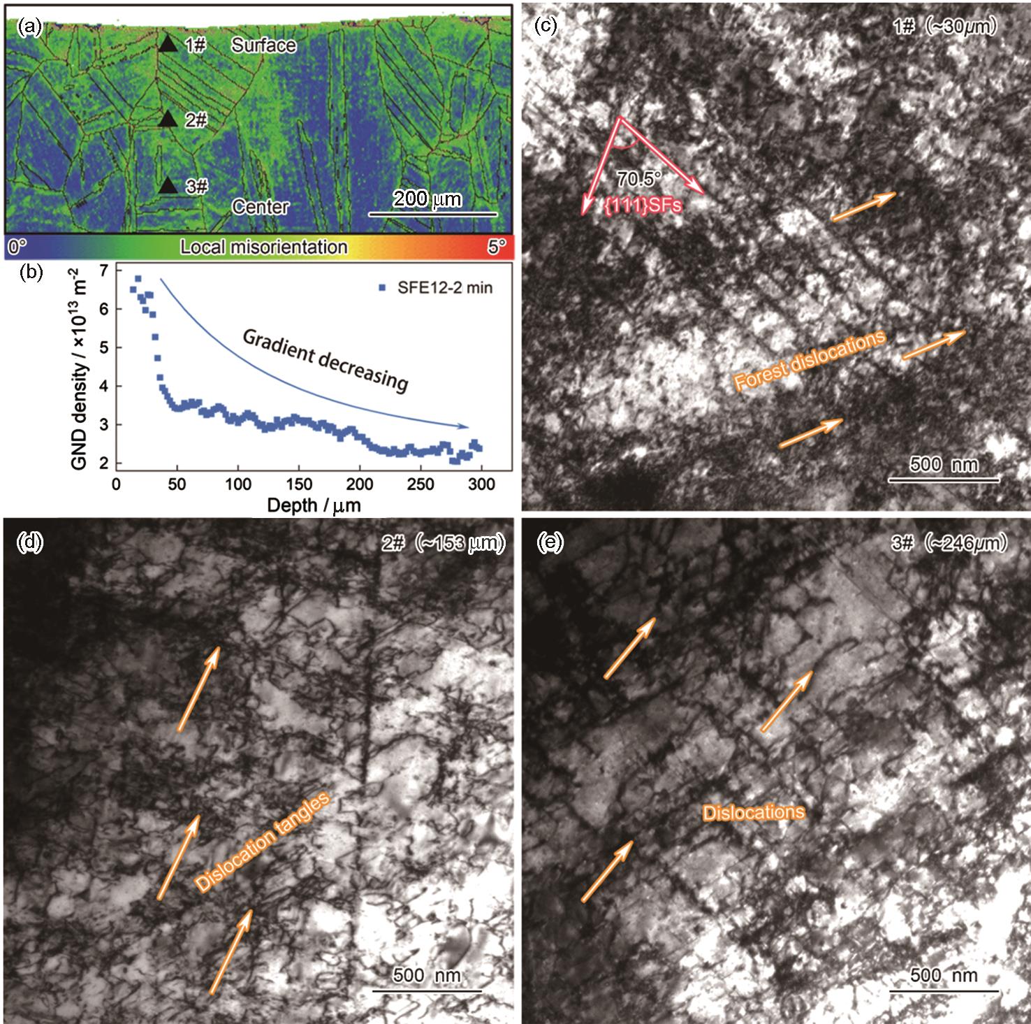 Fig.2 Microstructure of gradient layer (a) KAM map of the depth ~300 μm depth, characterized by EBSD, (b) The GND distribution map with depth, calculated by the average KAM statistics in (a), (c~e) TEM bright field image of ~30 μm, ~153 μm, ~246 μm depth, respectively |