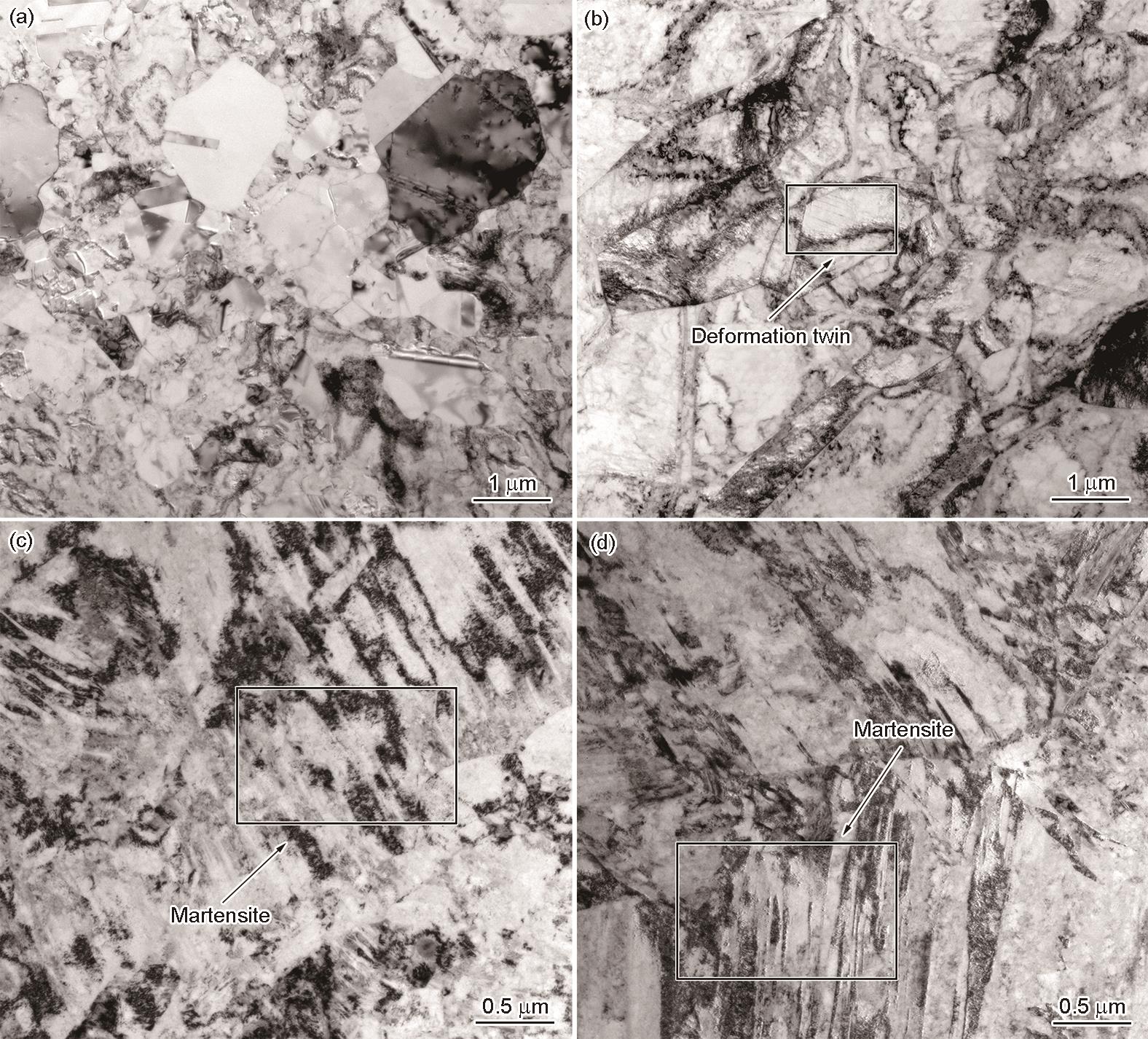 | Fig.6 TEM images show the tensile deformed microstructures of the sample (a) EPT-7LN-293 K; (b) EPT-7.5LN-293 K; (c) EPT-7LN-77 K; (d) EPT-7.5LN-77 K |